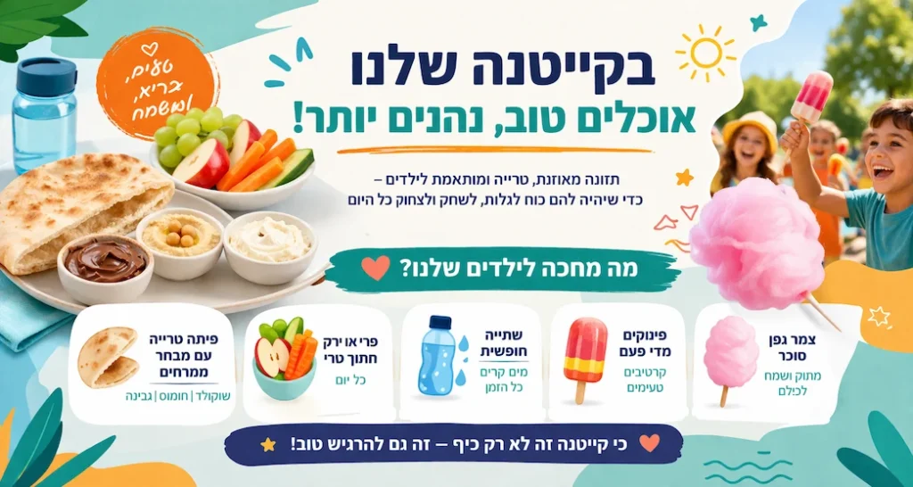בקיץ על גלגלים הילדים נהנים ממזון עשיר, מגוון ובריא, שמותאם ליום פעילות מלא. בנוסף, אנחנו מקפידים על משמעת מים מוקפדת לאורך כל היום כדי לשמור על רעננות ובטיחות בקיץ