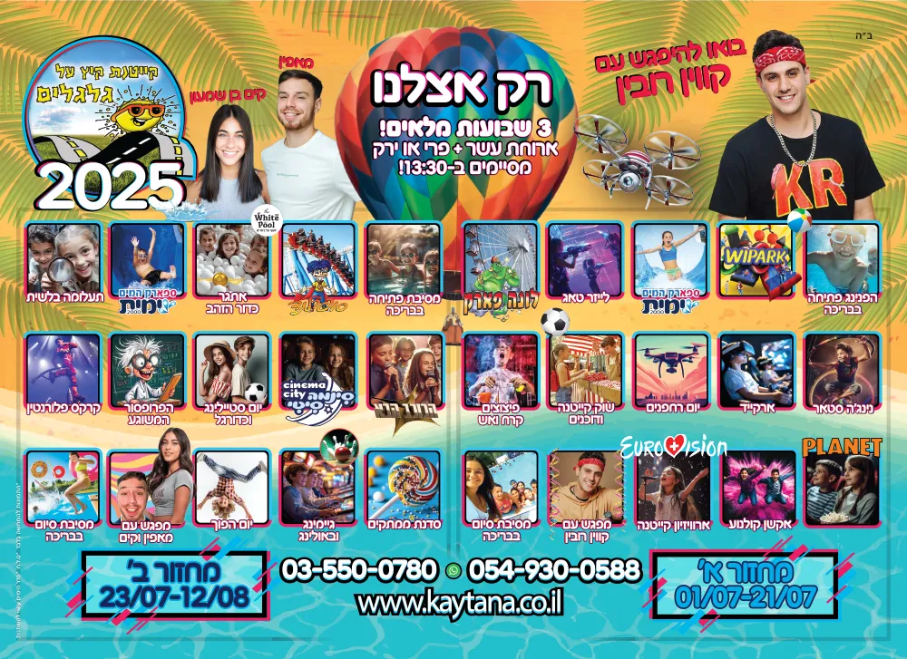 הצטרפו ל-קייטנת קיץ על גלגלים והבטיחו לילדים שלכם קיץ מלא הנאה, חברים, פעילויות וזיכרונות שילוו אותם עוד שנים קדימה.